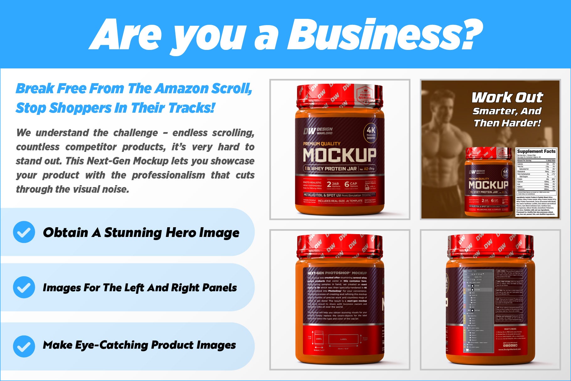 - Nutrition Brands: Use our mockup to create Amazon listing/product hero image and powerful marketing materials that showcase your product in the best way possible.