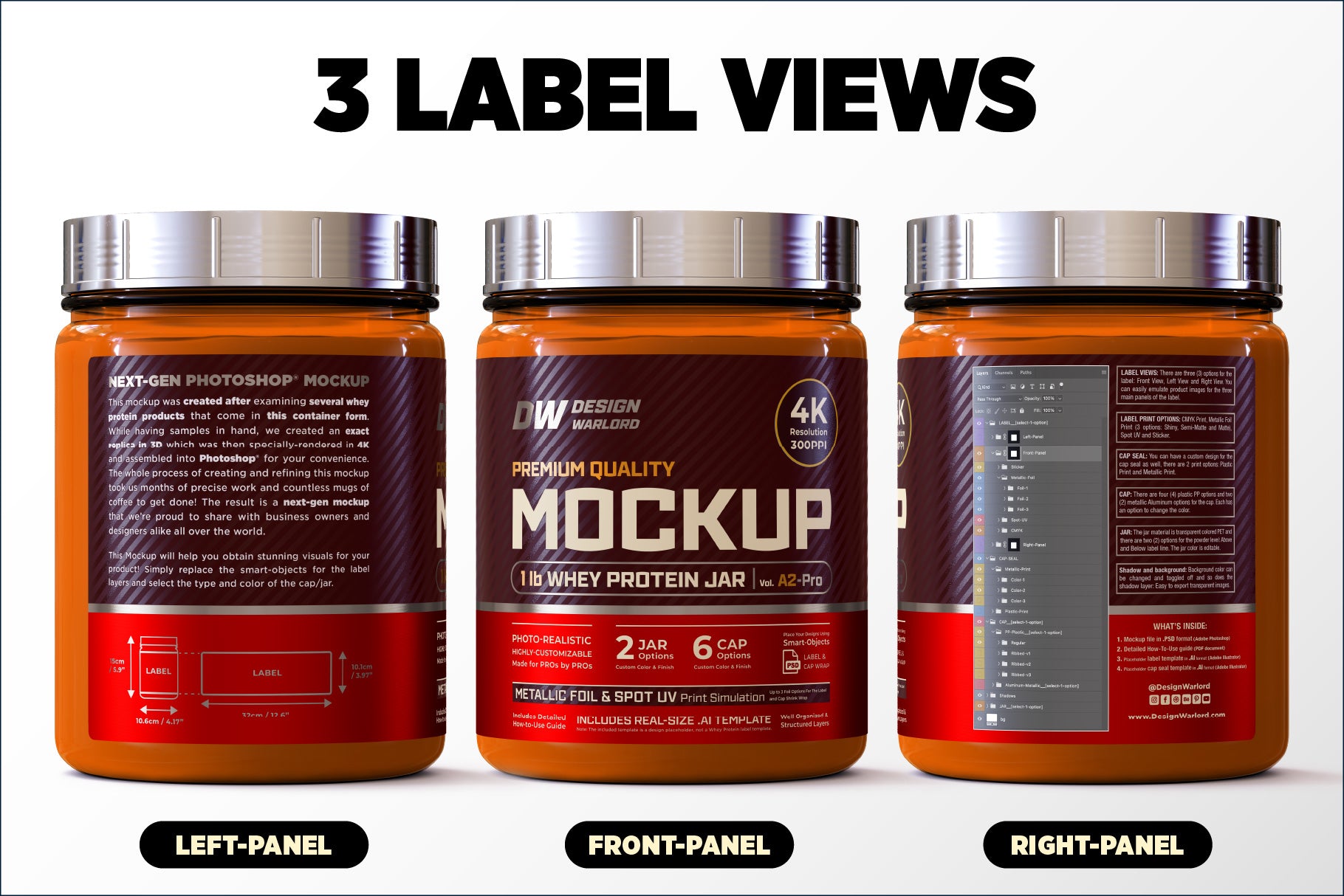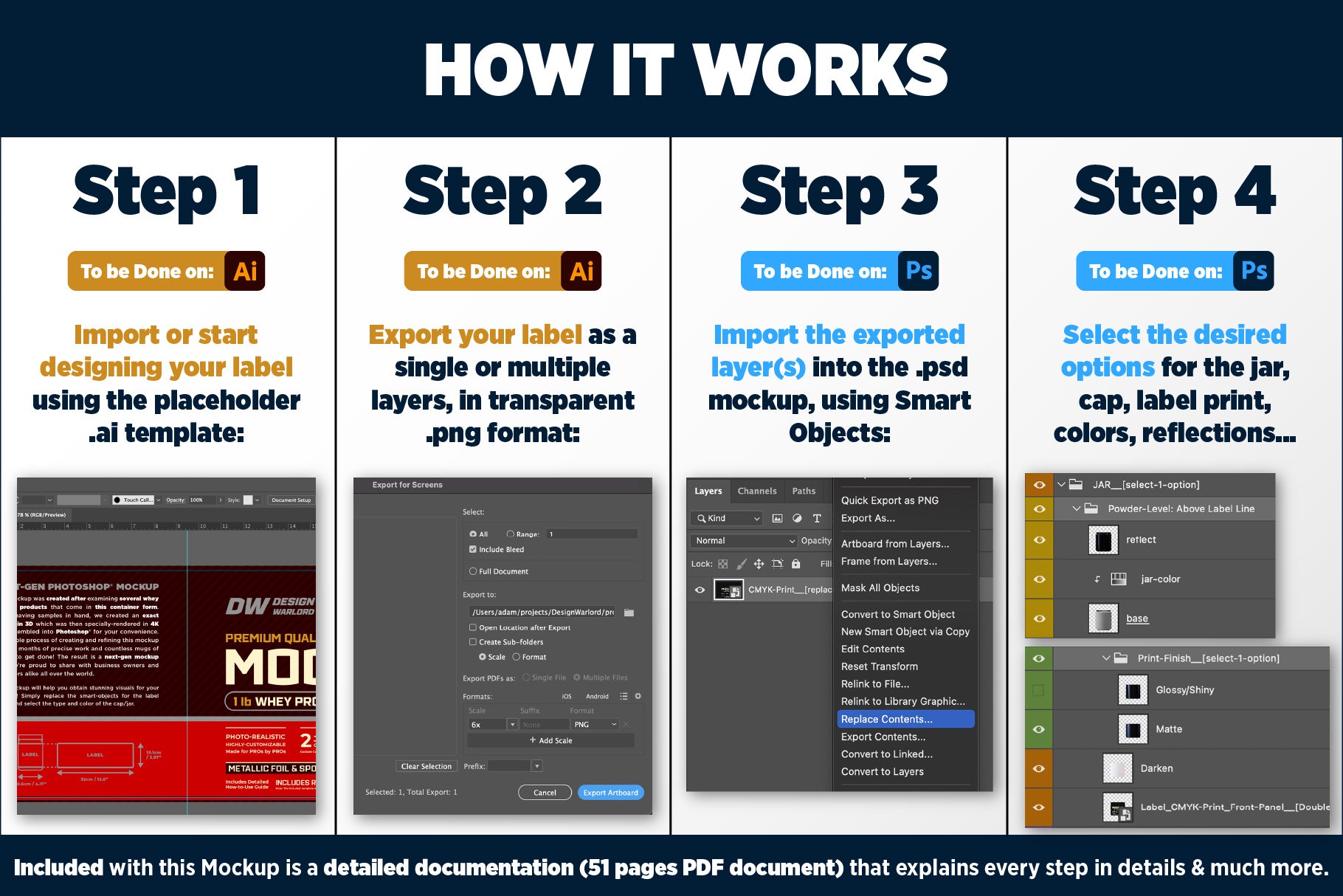 - Seamless Label Integration: The included placeholder template takes the guesswork out of label design! Simply use the template to create or import your existing label design into it, export the layer(s) as .png images, then import them (via Right-Click -> Replace Contents…) right into the Next-Gen Mockup! Everything is placed in a pixel-perfect way: No need for moving/scaling the label artwork inside the Mockup's Smart Objects – focus on unleashing your creativity!