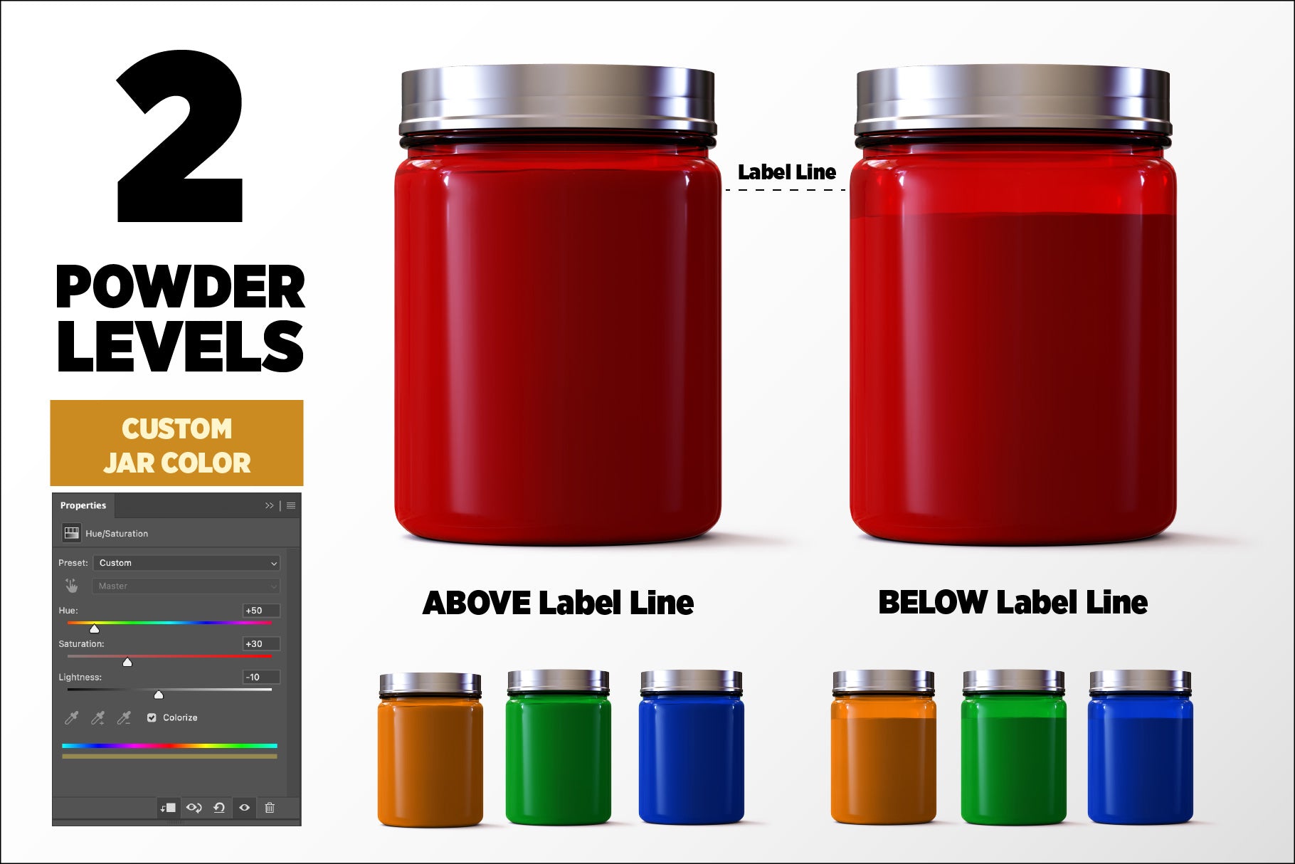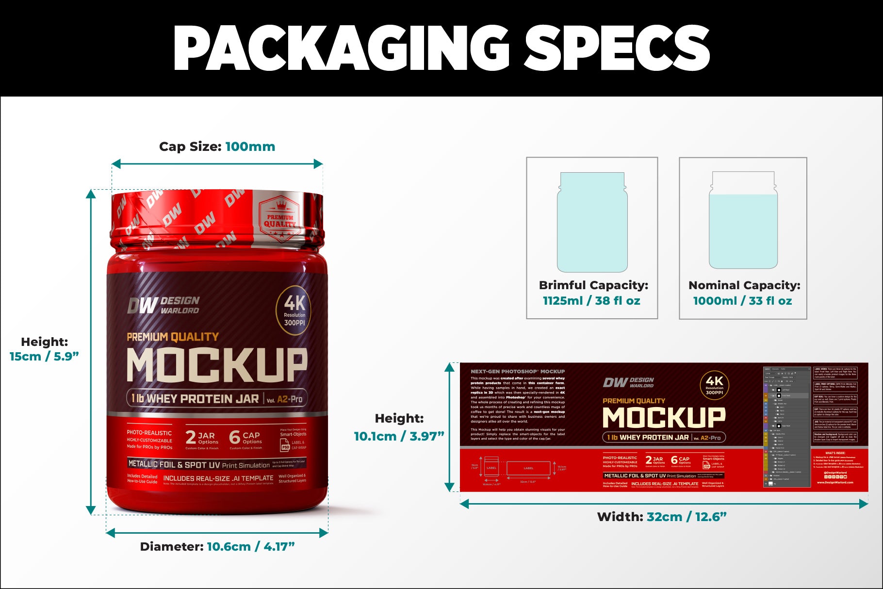 This mockup mirrors the exact size and shape of this standard protein jar: