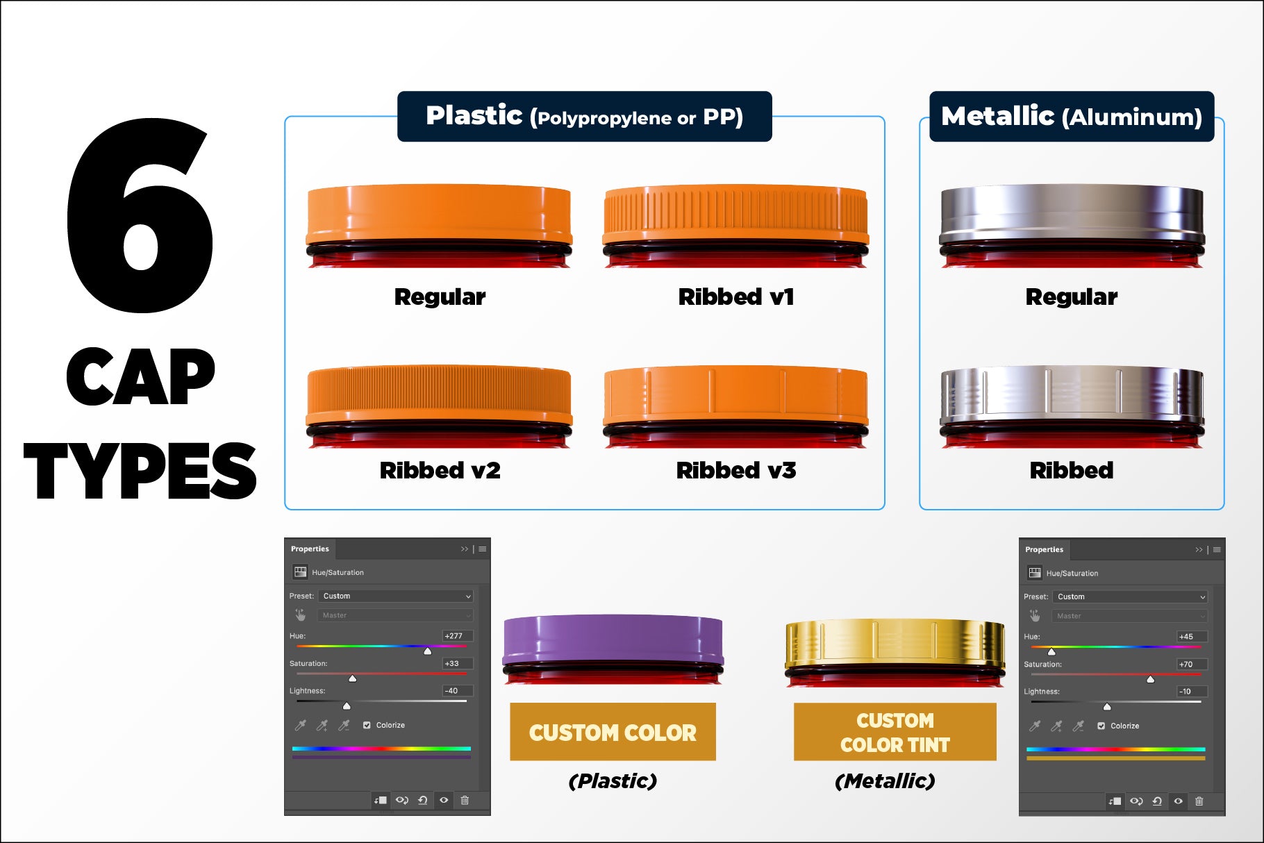 - 6 cap types: 4 PP plastic and 2 aluminum metallic caps | ribbed and regular