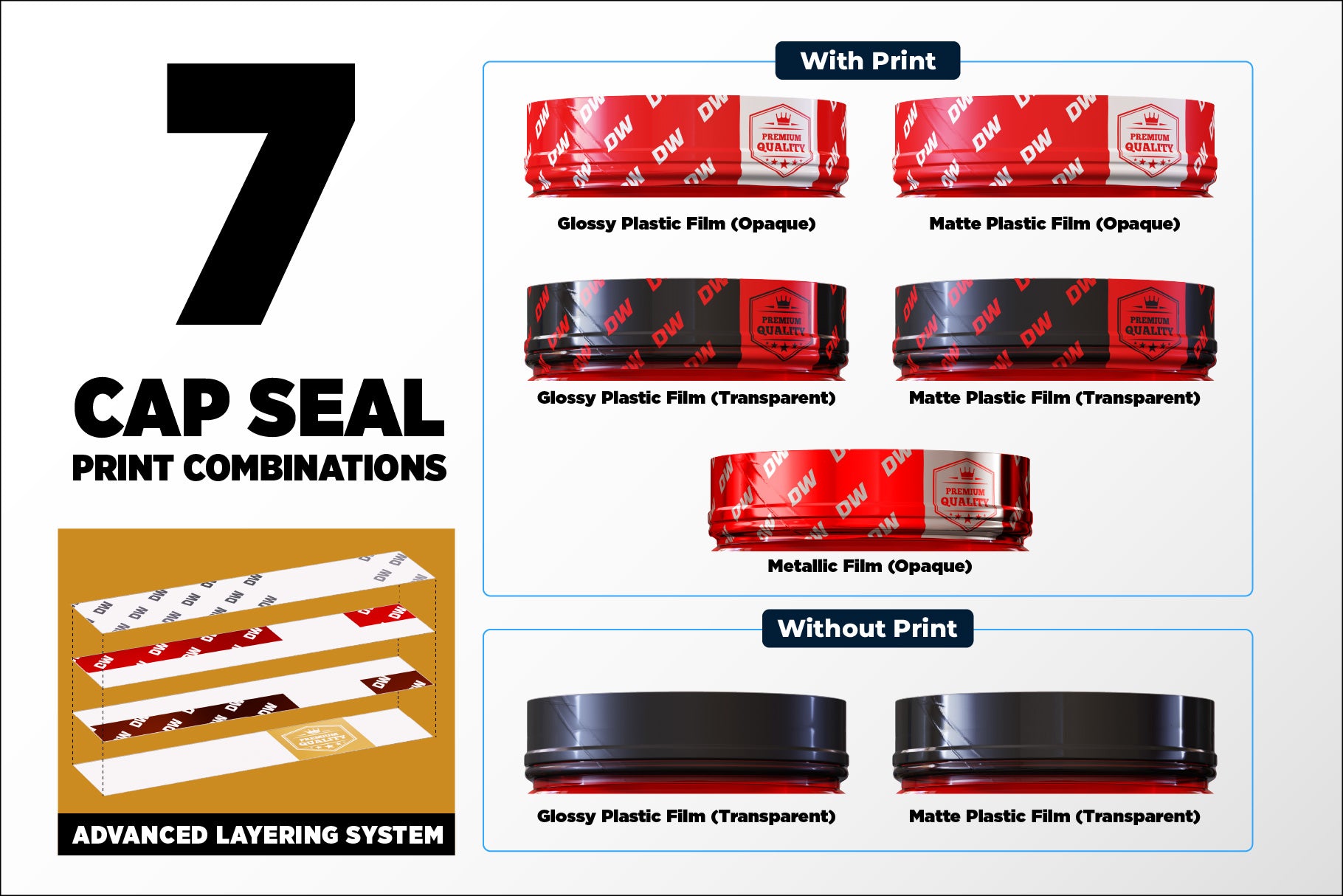 7 Cap seal print combinations (Matte/Glossy plastic film, opaque/transparent plastic film, opaque metallic film…)