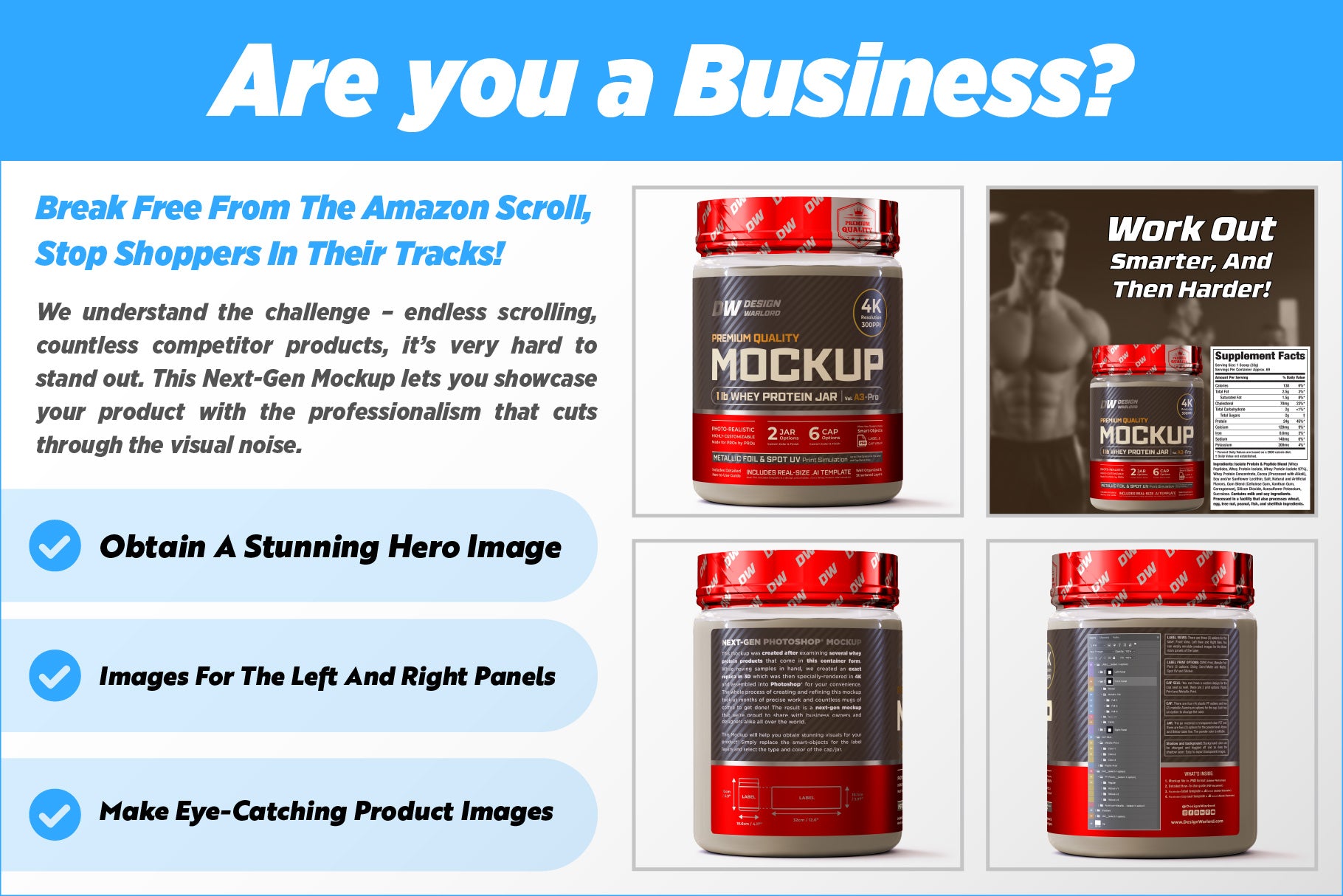 • Nutrition Brands: Use our mockup to create Amazon listing/product hero image and powerful marketing materials that showcase your product in the best way possible.