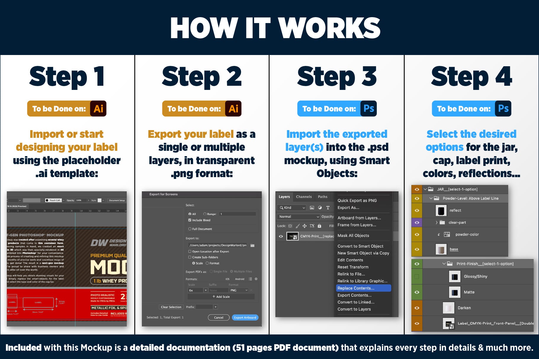 • Seamless Label Integration: The included placeholder template takes the guesswork out of label design! Simply use the template to create or import your existing label design into it, export the layer(s) as .png images, then import them (via Right-Click -> Replace Contents…) right into the Next-Gen Mockup! Everything is placed in a pixel-perfect way: No need for moving/scaling the label artwork inside the Mockup's Smart Objects – focus on unleashing your creativity!