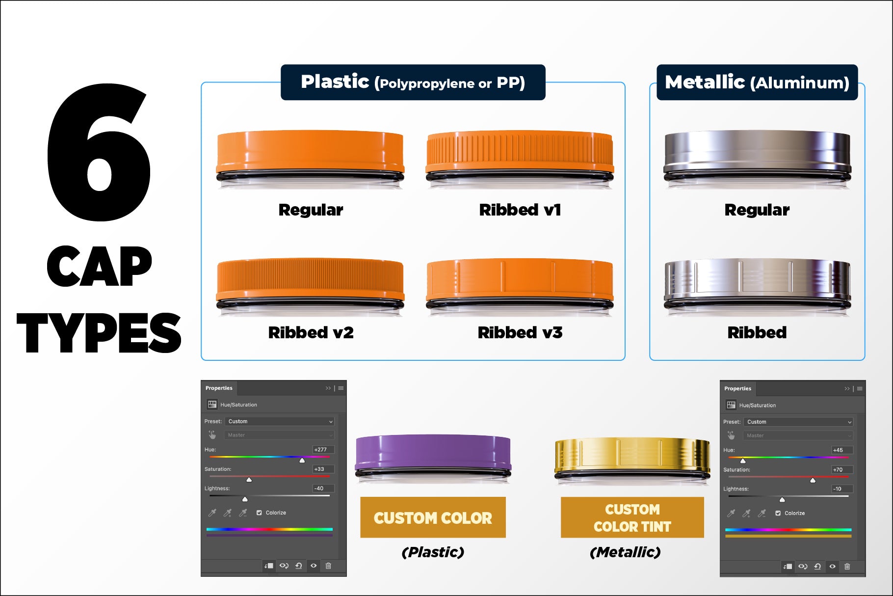 • 6 cap types: 4 PP plastic and 2 aluminum metallic caps | ribbed and regular