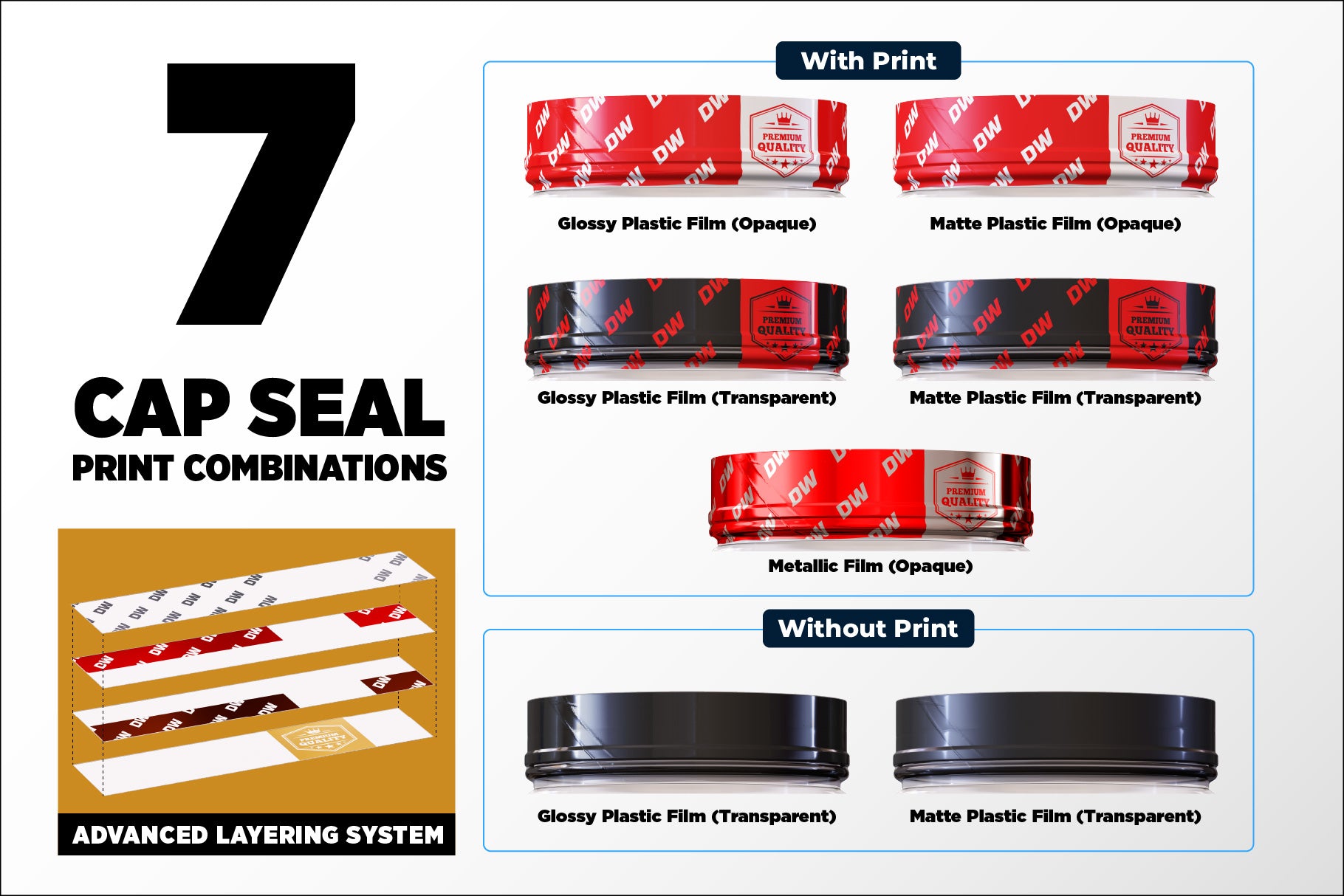 • 7 Cap seal print combinations (Matte/Glossy plastic film, opaque/transparent plastic film, opaque metallic film…)