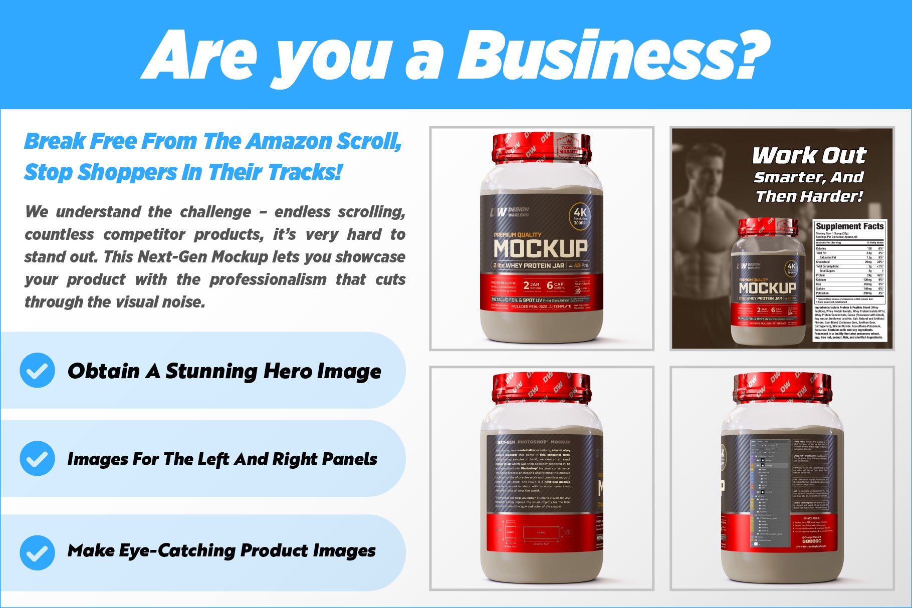 - Nutrition Brands: Use our mockup to create Amazon listing/product hero image and powerful marketing materials that showcase your product in the best way possible.
