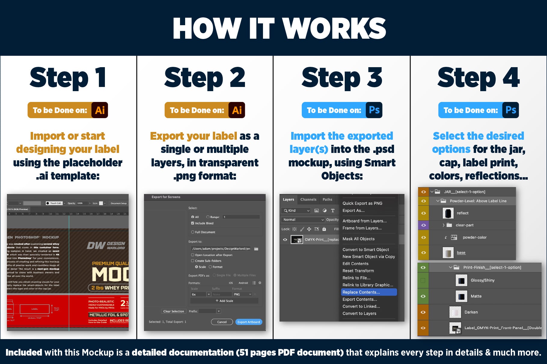 - Seamless Label Integration: The included placeholder template takes the guesswork out of label design! Simply use the template to create or import your existing label design into it, export the layer(s) as .png images, then import them (via Right-Click -> Replace Contents…) right into the Next-Gen Mockup! Everything is placed in a pixel-perfect way: No need for moving/scaling the label artwork inside the Mockup's Smart Objects – focus on unleashing your creativity!