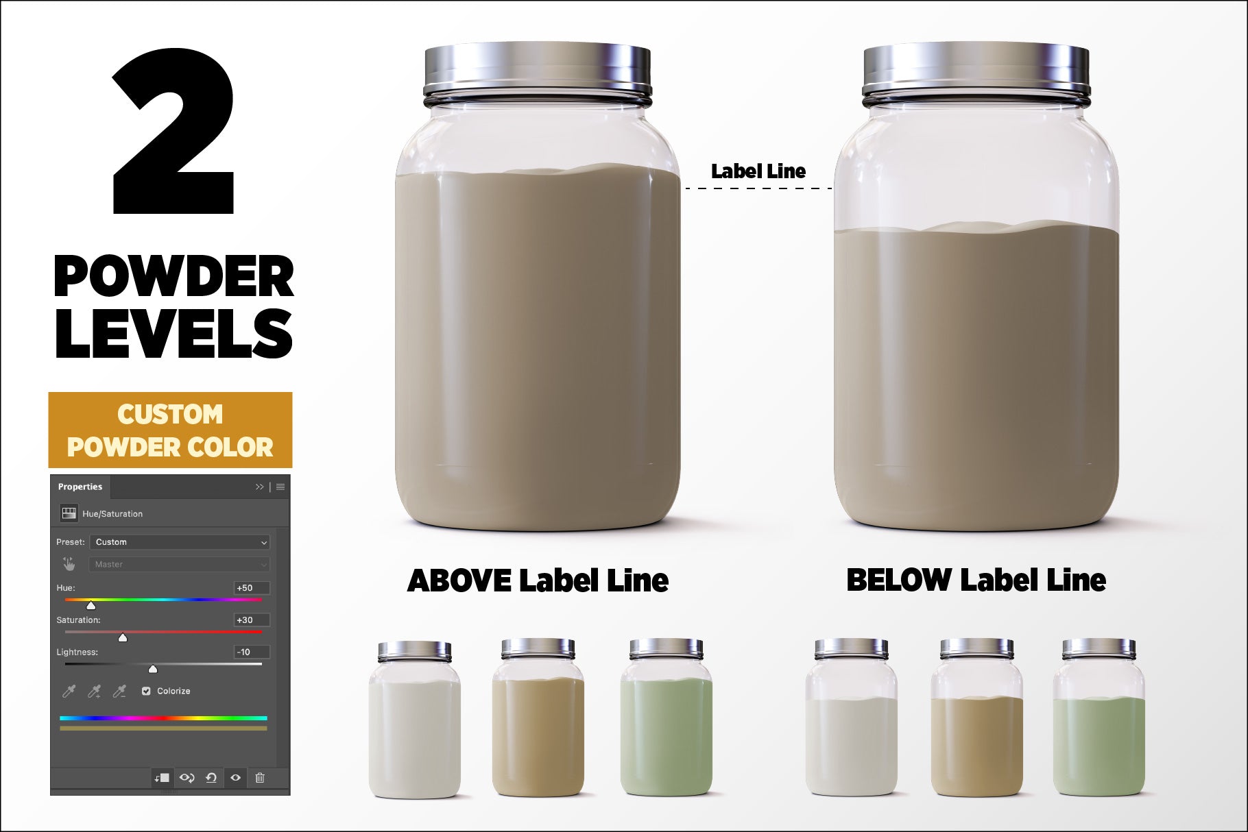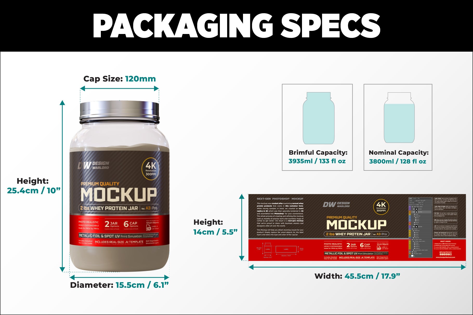 This mockup mirrors the exact size and shape of this standard protein jar: