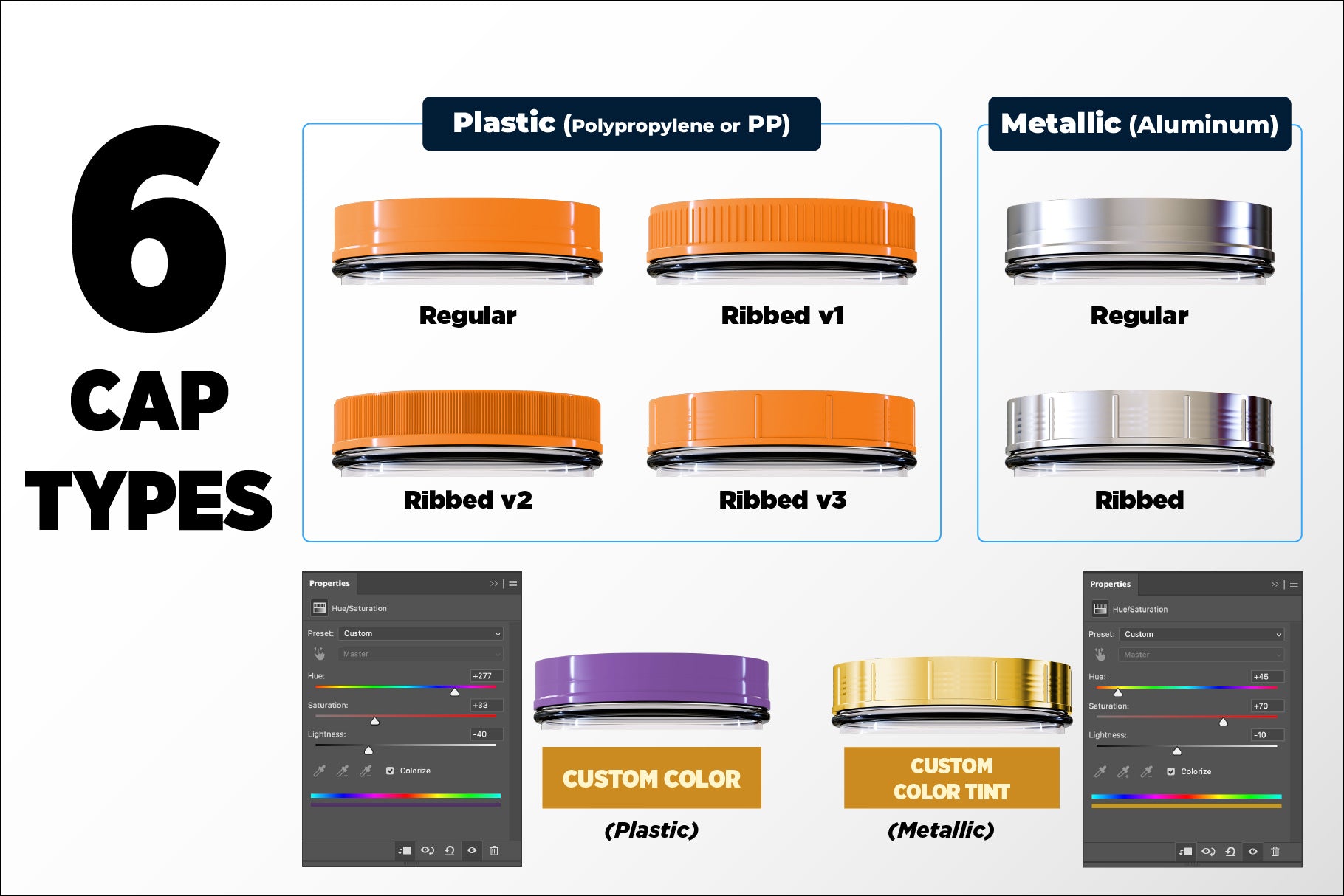 - 6 cap types: 4 PP plastic and 2 aluminum metallic caps | ribbed and regular
