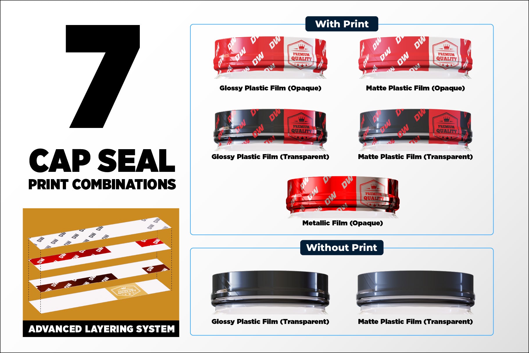 7 Cap seal print combinations (Matte/Glossy plastic film, opaque/transparent plastic film, opaque metallic film…)