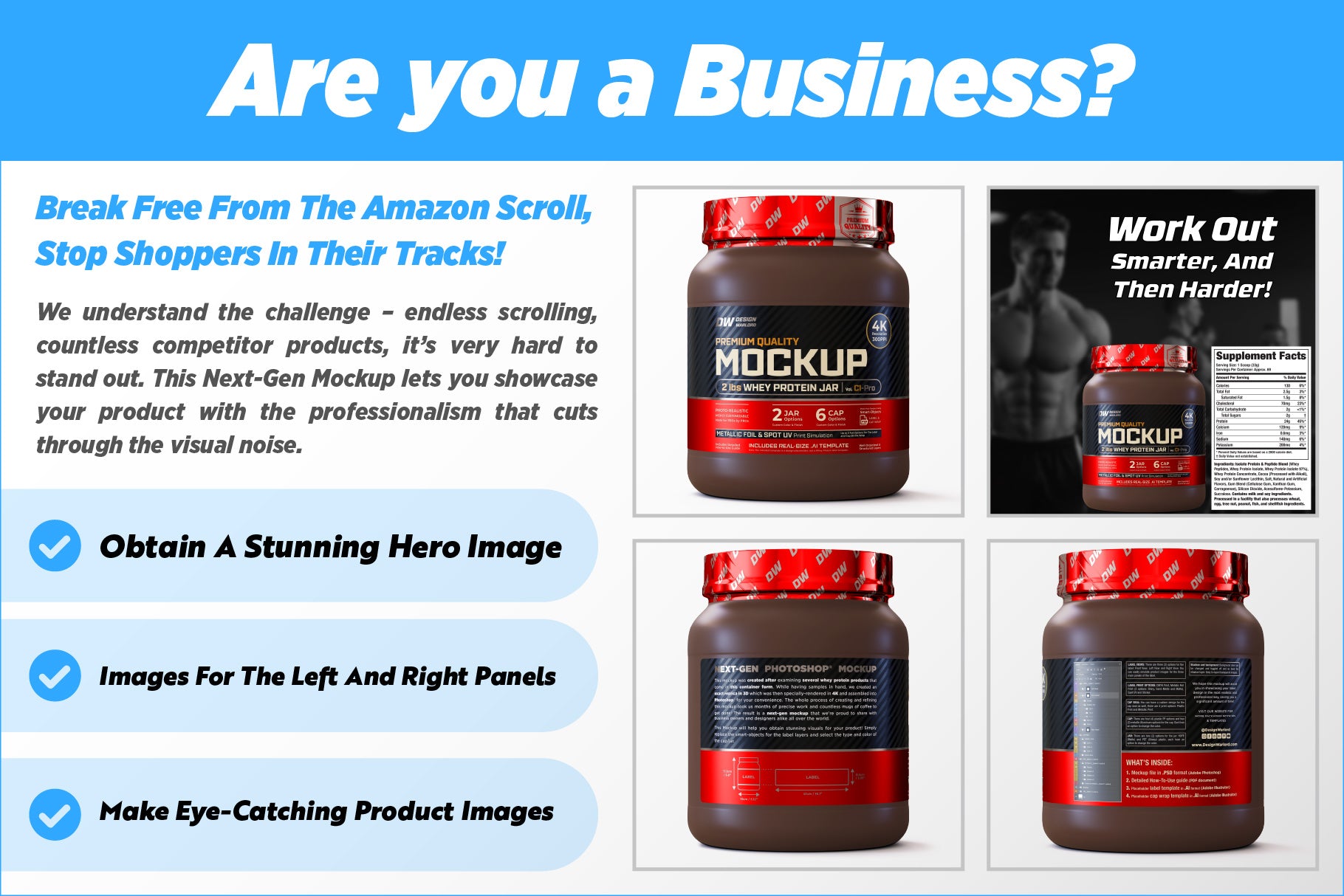 - Nutrition Brands: Use our mockup to create Amazon listing/product hero image and powerful marketing materials that showcase your product in the best way possible.