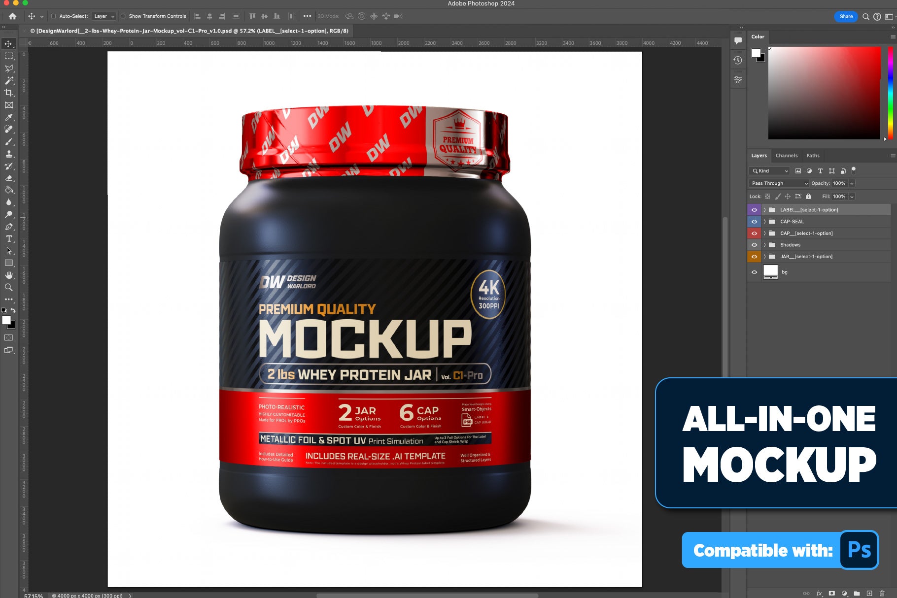 Next-Gen Premium Mockup for 2 lbs (two pounds) protein powder jar (Opaque PET & HDPE plastic), compatible with Adobe Photoshop®. Realistic visuals, accurate proportions. Includes placeholder label & cap seal templates. Ideal for nutrition brands, design agencies & graphic designers. Also works for protein & meal replacement powders, Pre-Workouts, Post-Workout, BCAAs...