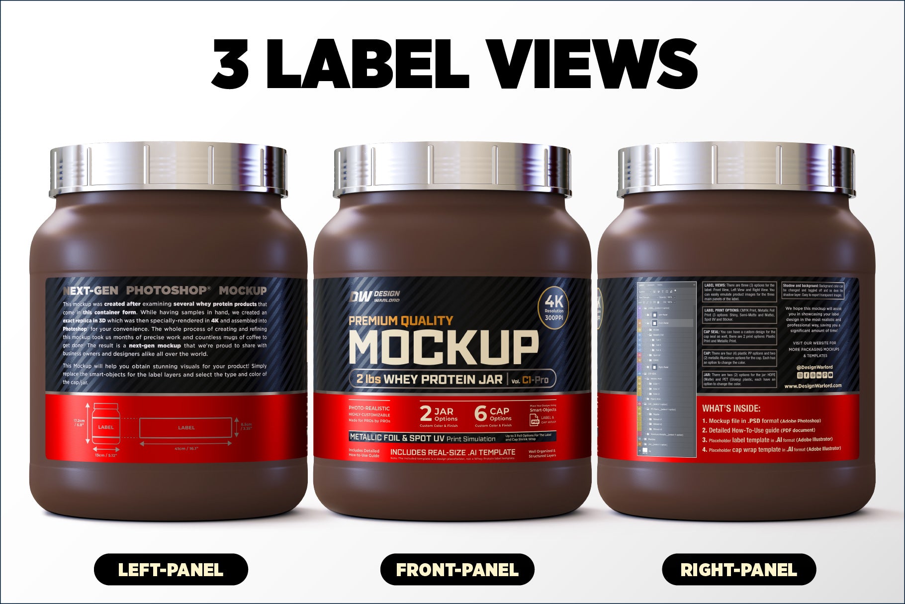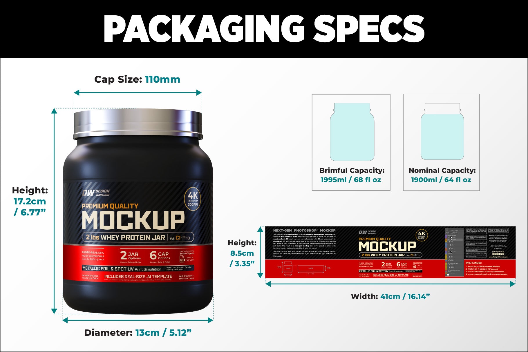 This mockup mirrors the exact size and shape of this standard protein jar: