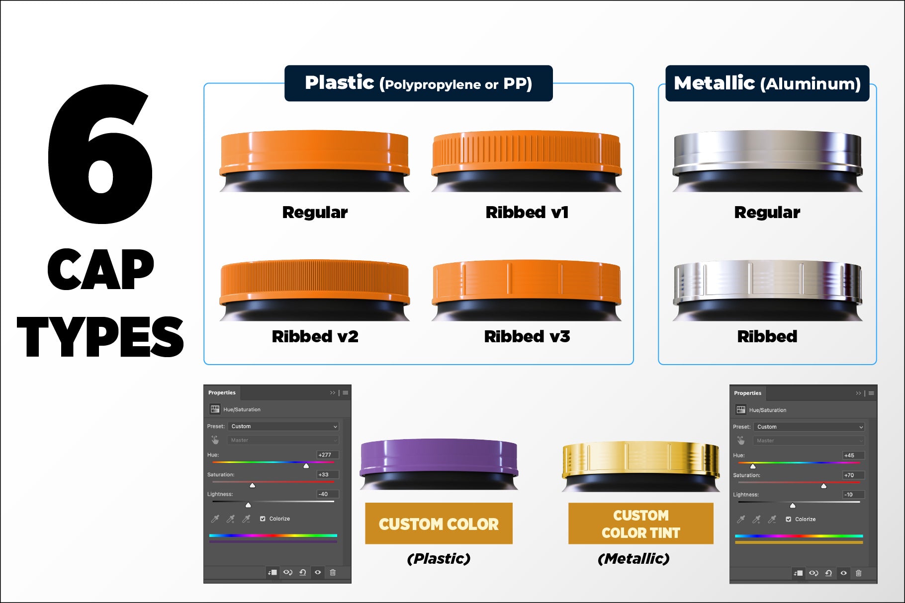 - 6 cap types: 4 PP plastic and 2 aluminum metallic caps | ribbed and regular