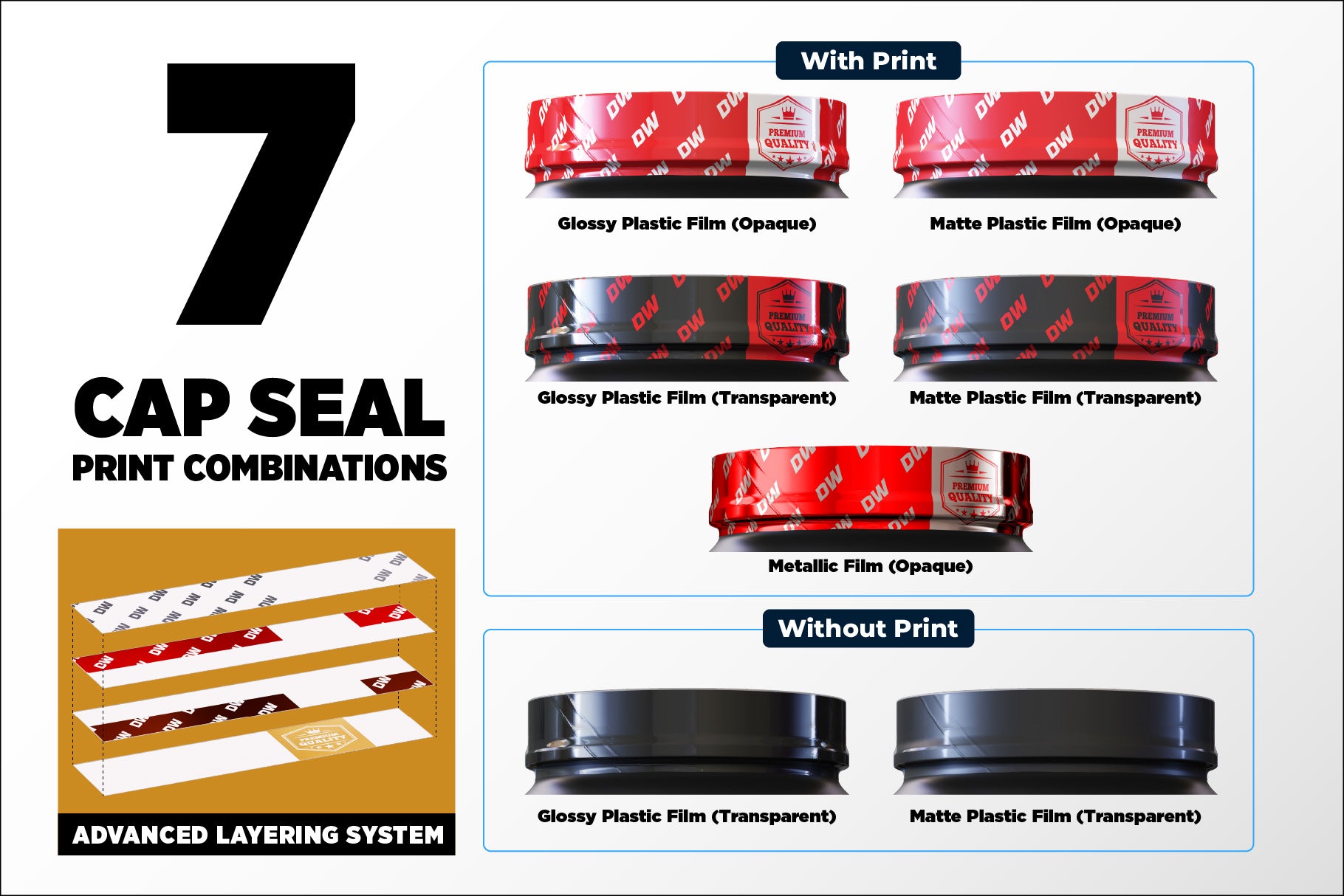 7 Cap seal print combinations (Matte/Glossy plastic film, opaque/transparent plastic film, opaque metallic film…)