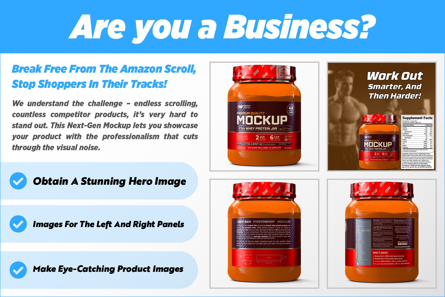 - Nutrition Brands: Use our mockup to create Amazon listing/product hero image and powerful marketing materials that showcase your product in the best way possible.