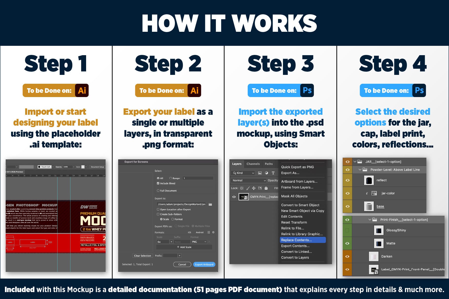 - Seamless Label Integration: The included placeholder template takes the guesswork out of label design! Simply use the template to create or import your existing label design into it, export the layer(s) as .png images, then import them (via Right-Click -> Replace Contents…) right into the Next-Gen Mockup! Everything is placed in a pixel-perfect way: No need for moving/scaling the label artwork inside the Mockup's Smart Objects – focus on unleashing your creativity!