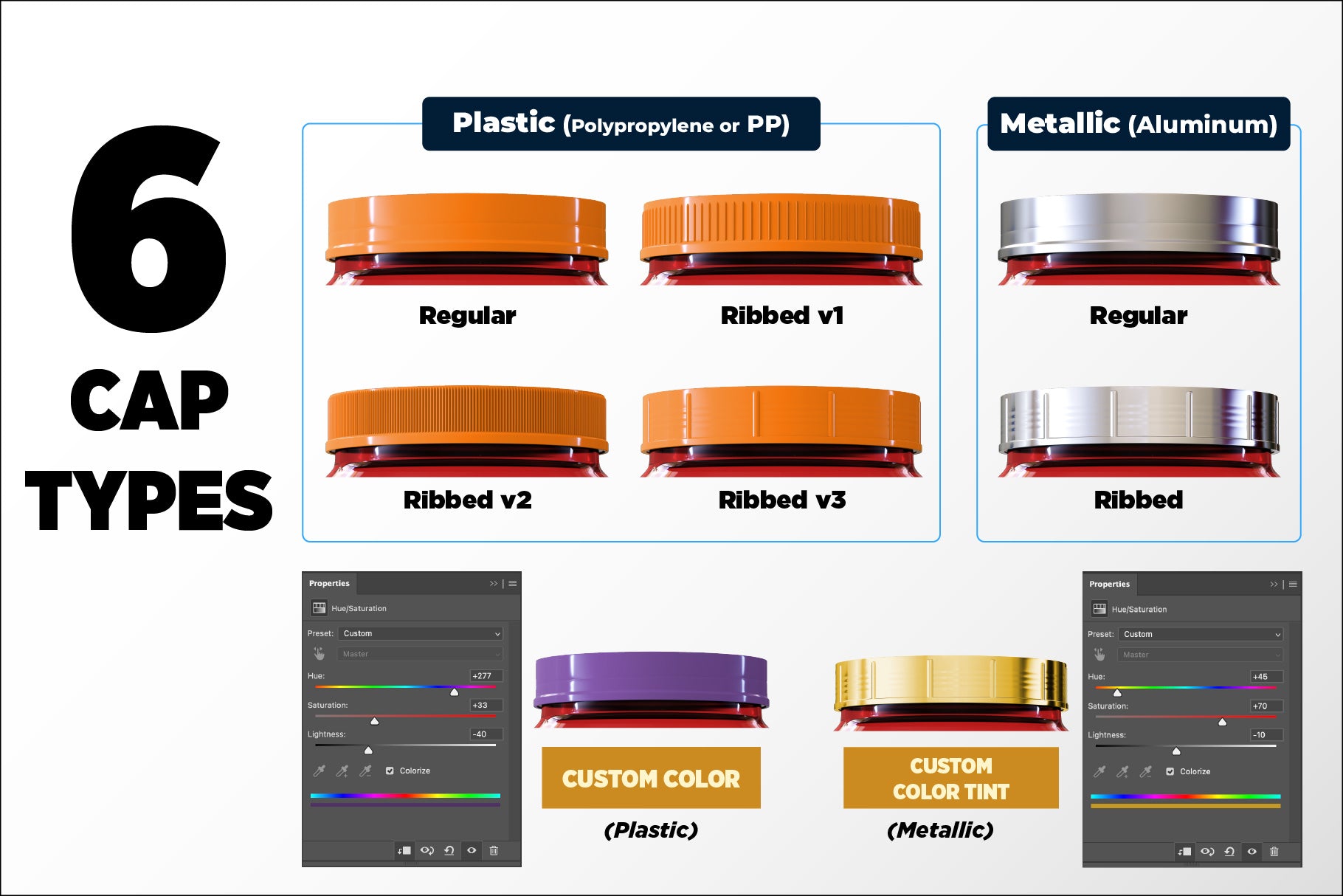 - 6 cap types: 4 PP plastic and 2 aluminum metallic caps | ribbed and regular