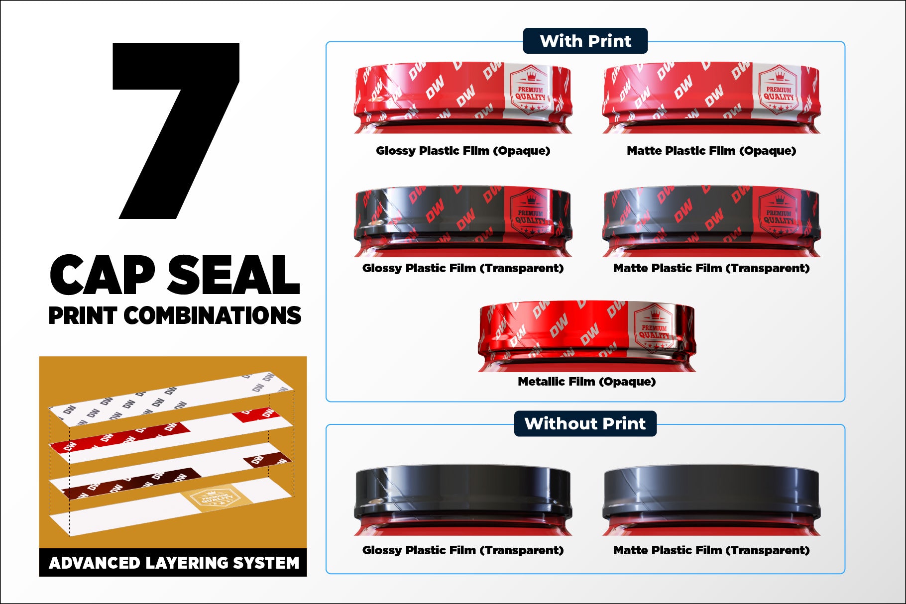 7 Cap seal print combinations (Matte/Glossy plastic film, opaque/transparent plastic film, opaque metallic film…)