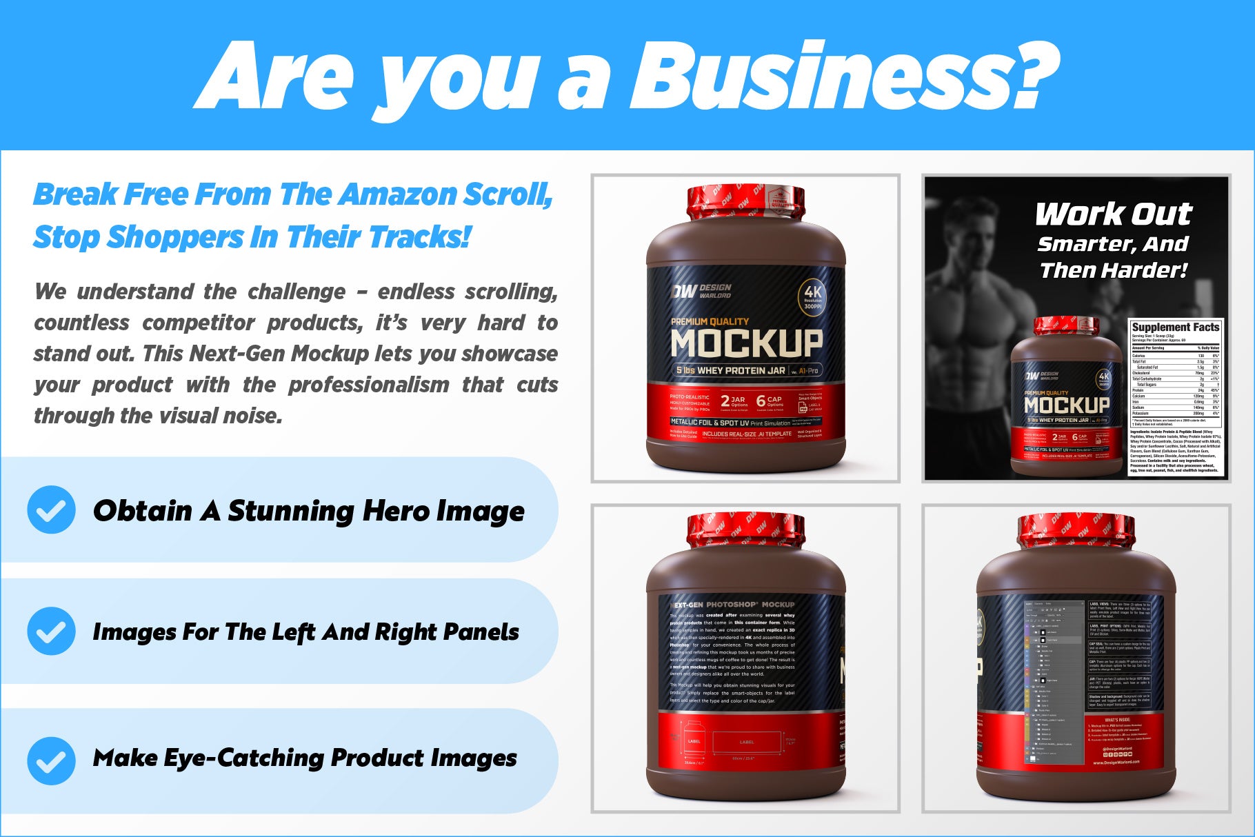 - Nutrition Brands: Use our mockup to create Amazon listing/product hero image and powerful marketing materials that showcase your product in the best way possible.