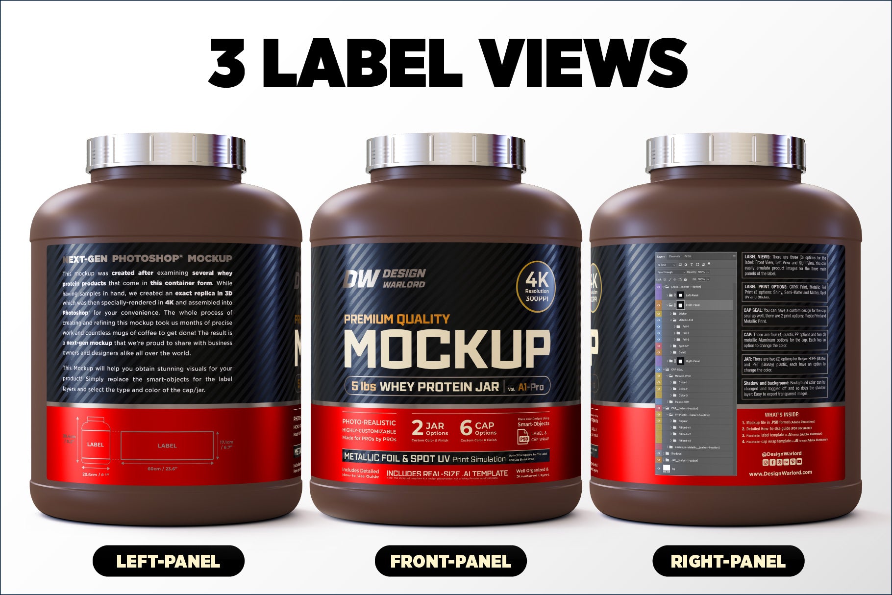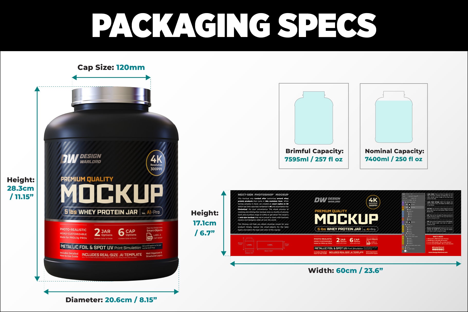 Next-Gen Premium Mockup for 5 lbs (five pounds) protein powder jar (Opaque PET & HDPE plastic), compatible with Adobe Photoshop®. Realistic visuals, accurate proportions. Includes placeholder label & cap seal templates. Ideal for nutrition brands, design agencies & graphic designers. Also works for protein & meal replacement powders, Pre-Workouts, Post-Workout, BCAAs...