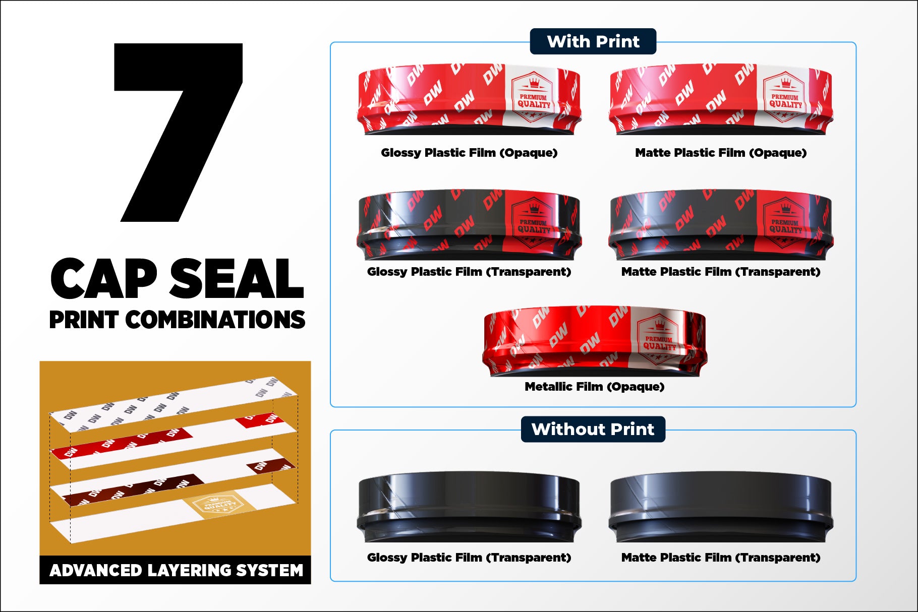 7 Cap seal print combinations (Matte/Glossy plastic film, opaque/transparent plastic film, opaque metallic film…)