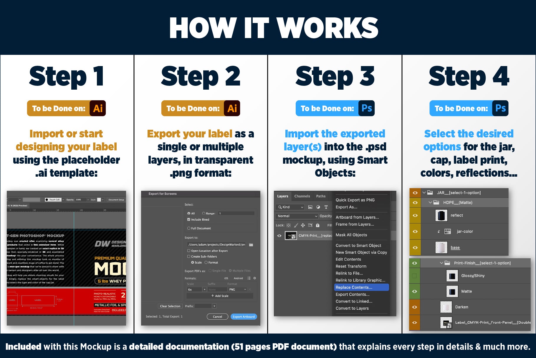 - Seamless Label Integration: The included placeholder template takes the guesswork out of label design! Simply use the template to create or import your existing label design into it, export the layer(s) as .png images, then import them (via Right-Click -> Replace Contents…) right into the Next-Gen Mockup! Everything is placed in a pixel-perfect way: No need for moving/scaling the label artwork inside the Mockup's Smart Objects – focus on unleashing your creativity!