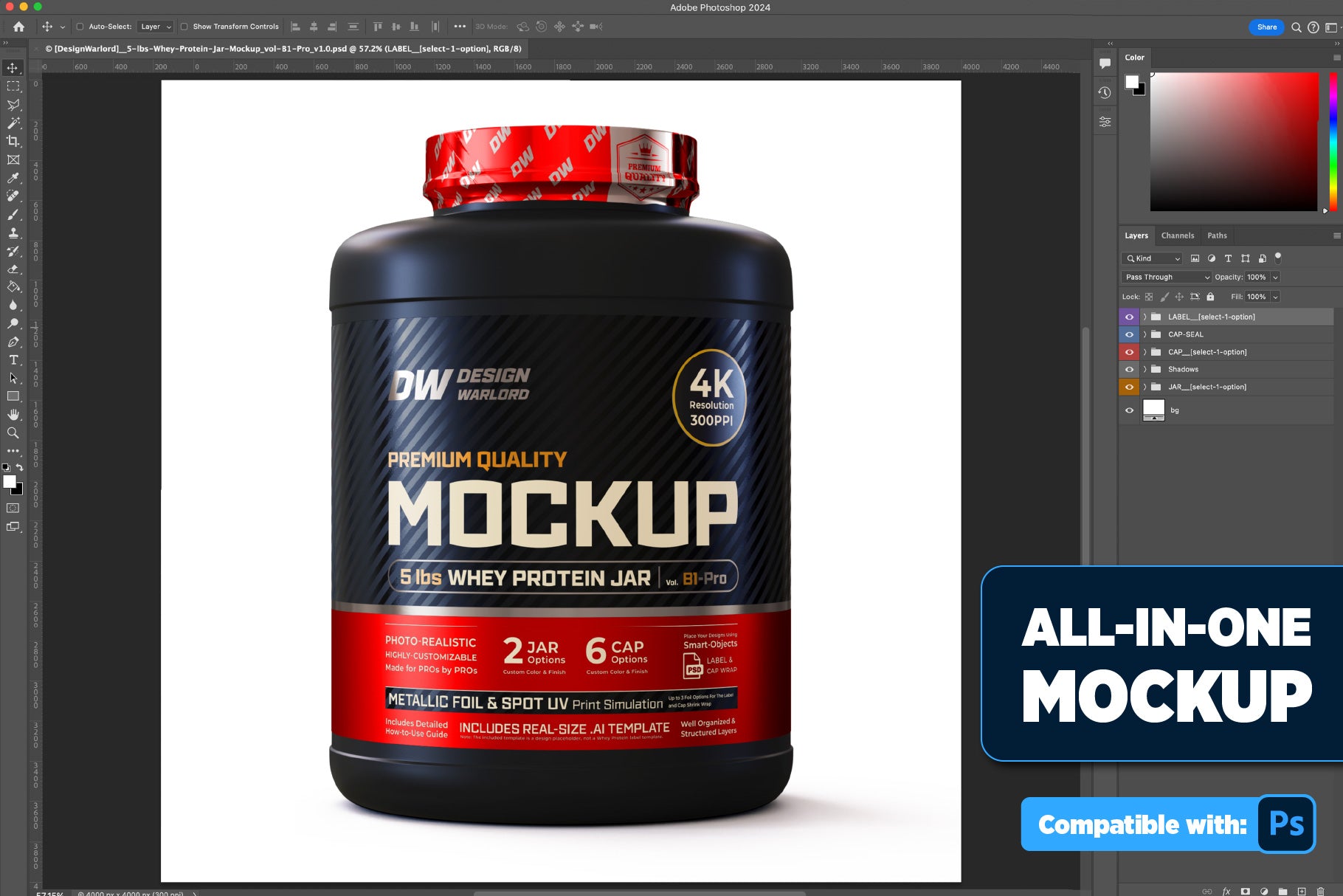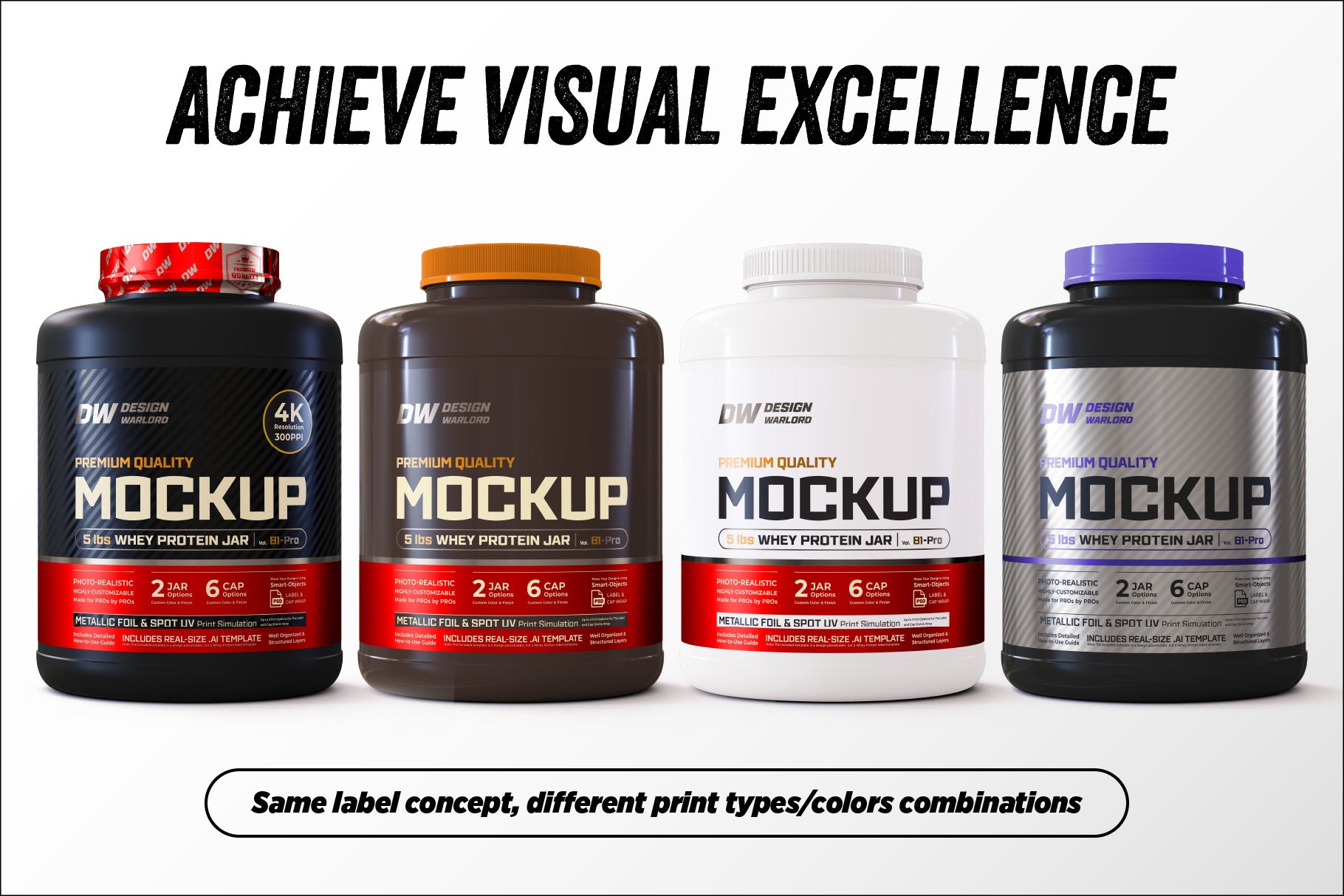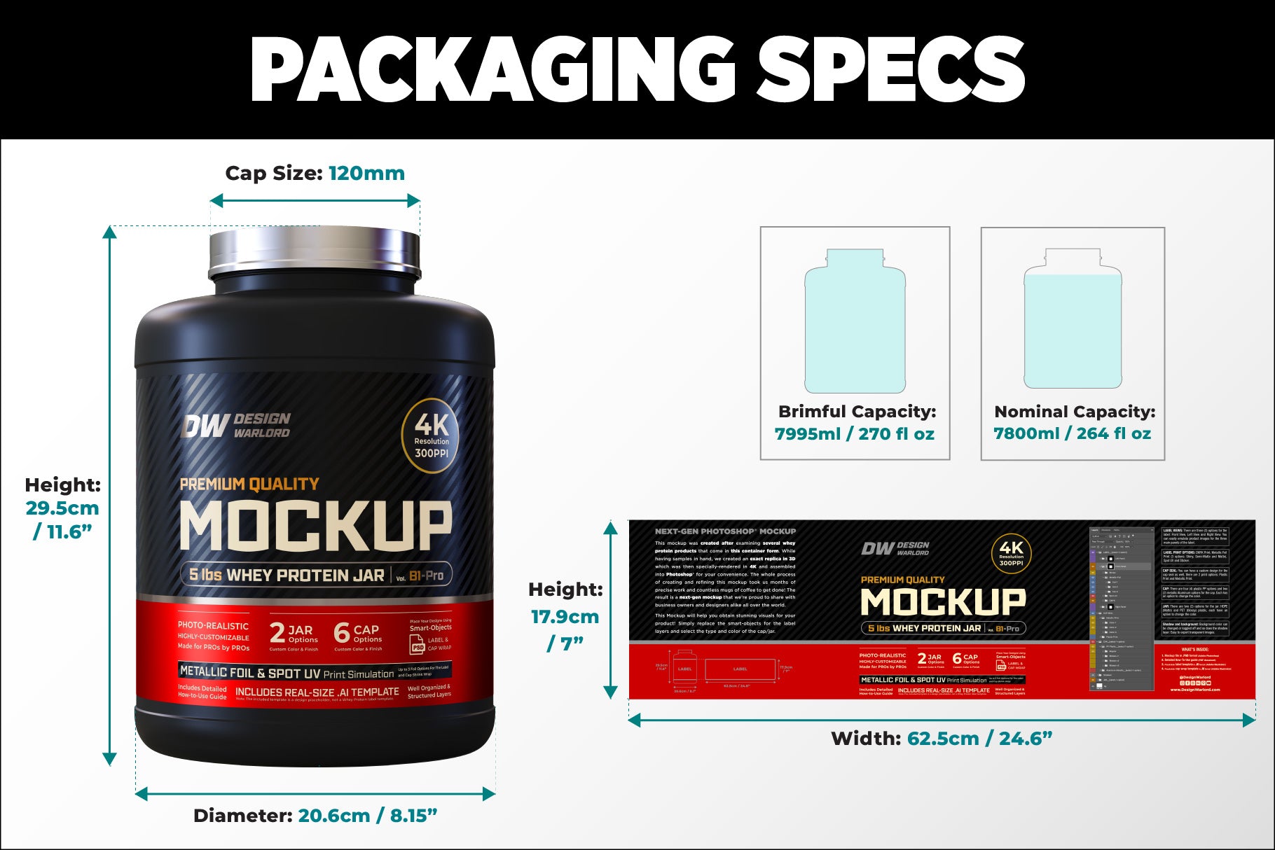 Next-Gen Premium Mockup for 5 lbs (five pounds) protein powder jar (Opaque PET & HDPE plastic), compatible with Adobe Photoshop®. Realistic visuals, accurate proportions. Includes placeholder label & cap seal templates. Ideal for nutrition brands, design agencies & graphic designers. Also works for protein & meal replacement powders, Pre-Workouts, Post-Workout, BCAAs...