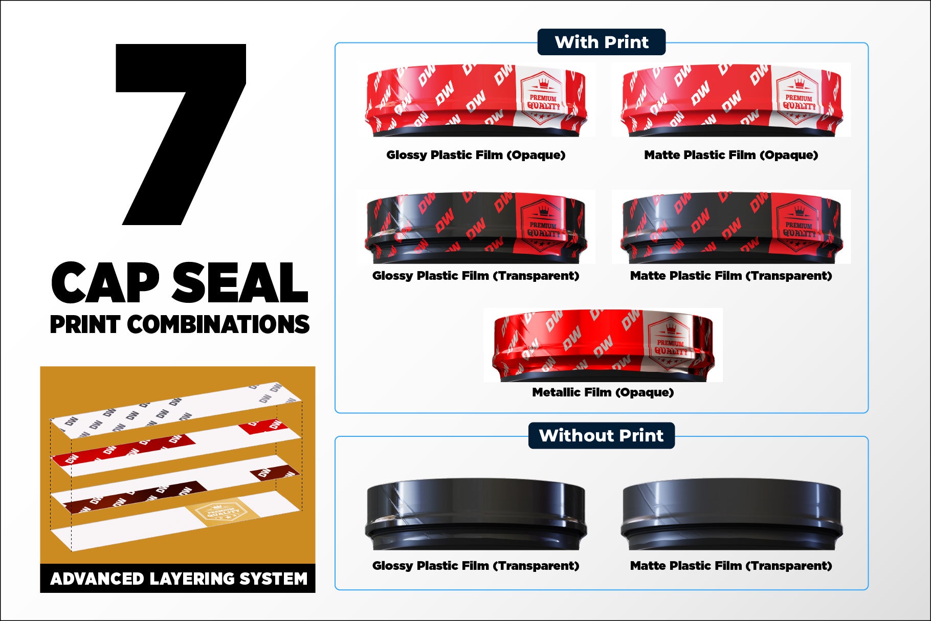 7 Cap seal print combinations (Matte/Glossy plastic film, opaque/transparent plastic film, opaque metallic film…)